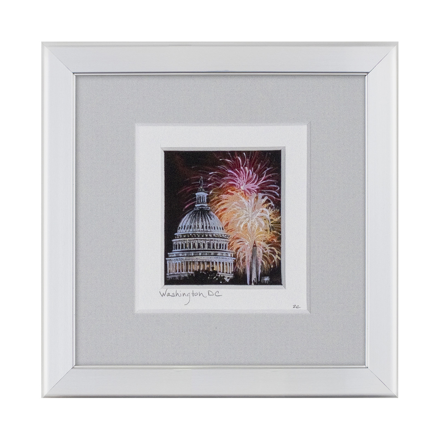 The Single Mini in satin finished silver metal frame complete with a double mat of ivory over white, a high resolution print of an original watercolor painting, custom pencil titled and protective glass. Distinctive and memorable. Image, layout and framing materials can be customized for your special project. Includes picture hanger. Classy and unique. An outstanding value people cherish & proudly display. Easy to handle and ship. 5.5" W x 5.5" H