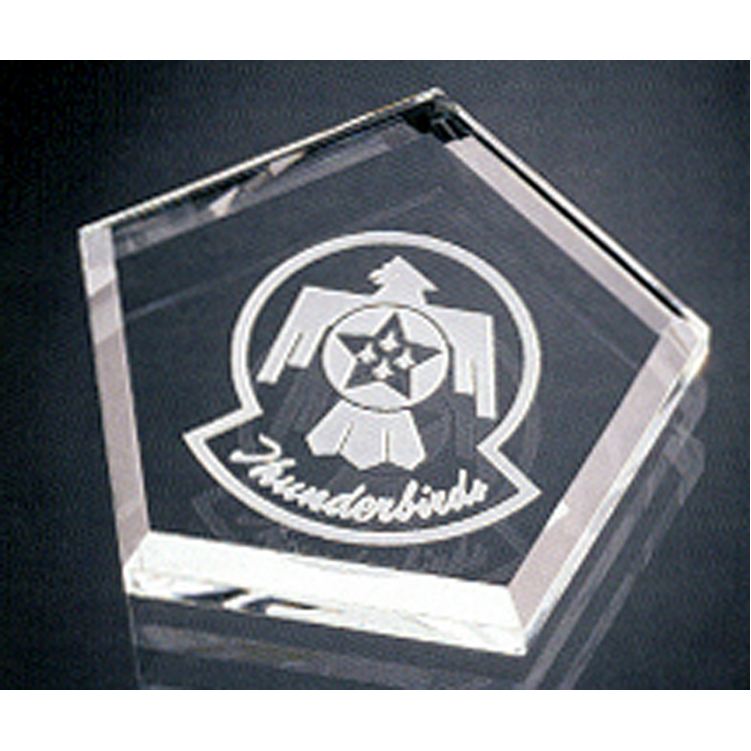 A "Pentagon" has become synonymous with strength and fortitude. Give this paperweight to the source of your strength: your employees & staff, your clientele or your prospects. This Pentagon Pride Paperweight features a brilliantly polished bevel on BOTH sides of the glass! This Paperweight easily makes a set with other desk accessories such as nameplates, pen stands, business card holders, etc. 1/2" H x 3 1/8" W x 3" D