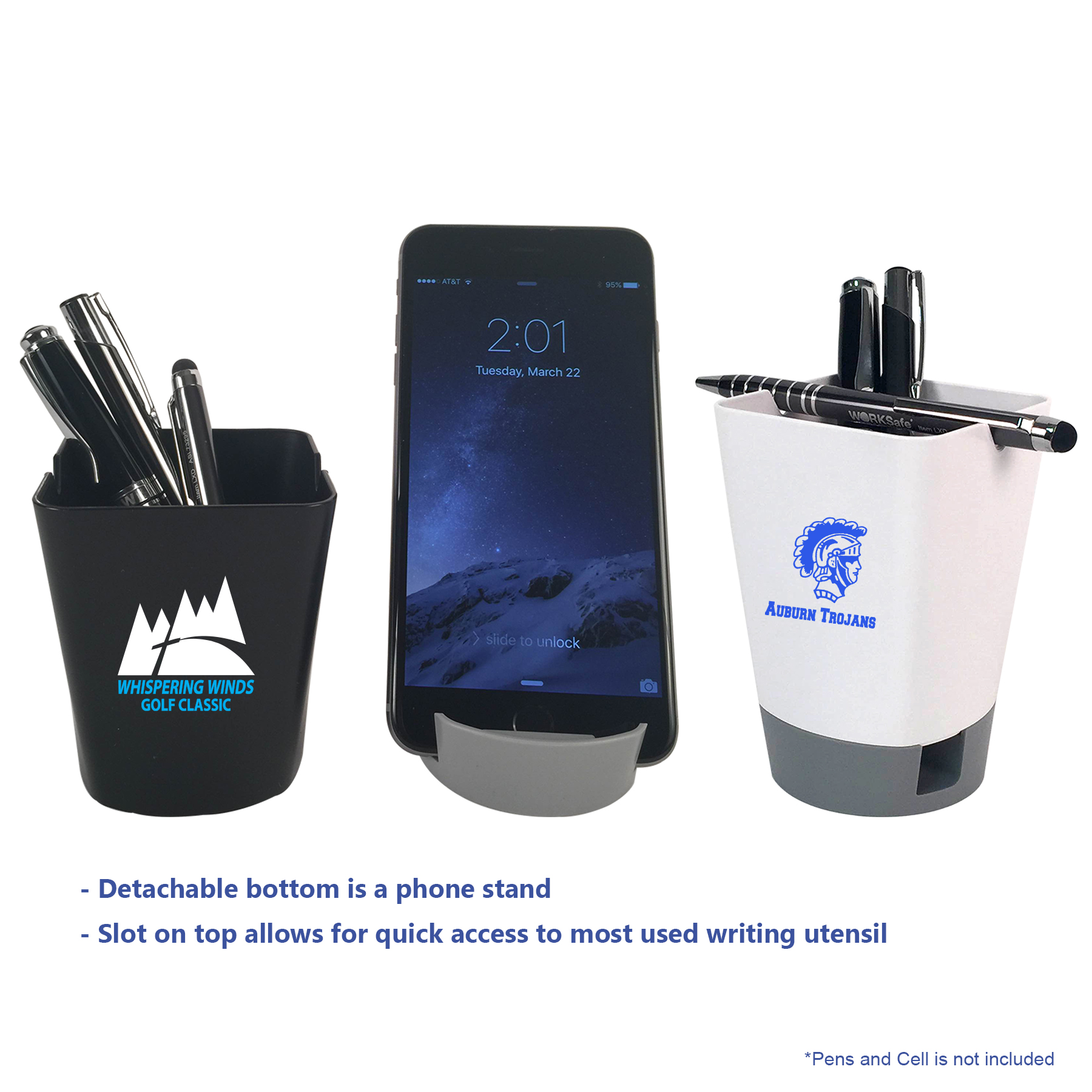 This unique product looks like a standard pen holder however it has a detachable bottom that is actually a cell phone stand. A pen holder is something everyone would find useful but the innovative twist of doubling as a cellphone holder really is eye catching. The small groove slot on the top can be used to place the writing utensil most commonly used for quick access. 2.875" W x 4.25" H