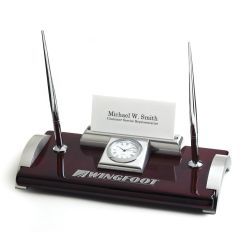 Start your own time"-honored tradition! With its wooden body and striking silver accents, the Ambassador is the pinnacle of function and design. Features a clock, a business card holder, and two ink pens. A handsome decoration for any setting, the Ambassador makes an excellent gift or award for any deserving employee. Measures 8" x 6 1/2" x 4" in dimension. May be purchased blank or customized with your company name and logo.". Complies with Prop 65. 8.0" W x 6.5" H x 4.0" D