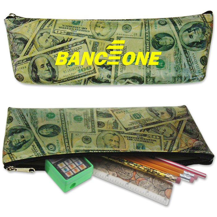 This item features a your own custom images with any lenticular effects, including flip, animation, and 3D depth. Setup charge is required. When the pencil case is tilted side to side, the front image changes according to your specifications. Blank USA currency stock design or stock design with one color imprint available. 8 1/2" L x 3" W