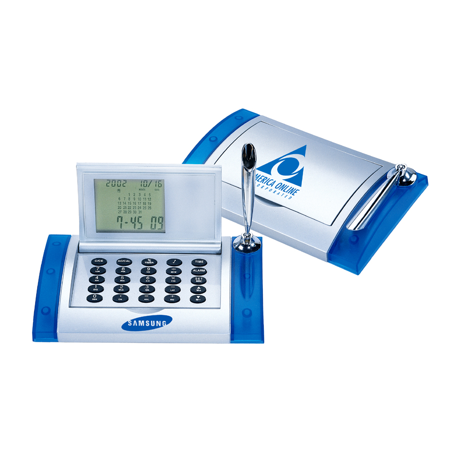 Keep your promotional message in view around the clock! This 3-in-1 multifunctional desktop and travel companion includes an alarm clock, 16 world time settings, 8 digit readout calculator, full month calendar with month, date, year readout and time of day display, pen holder, timer setting and pop-up readout window. With an eye-catching silver design, add an imprinted company logo or name. Be the brand they can count on! For your convenience, a battery is included. 4" L x 6 1/2" W x 1 1/4" H