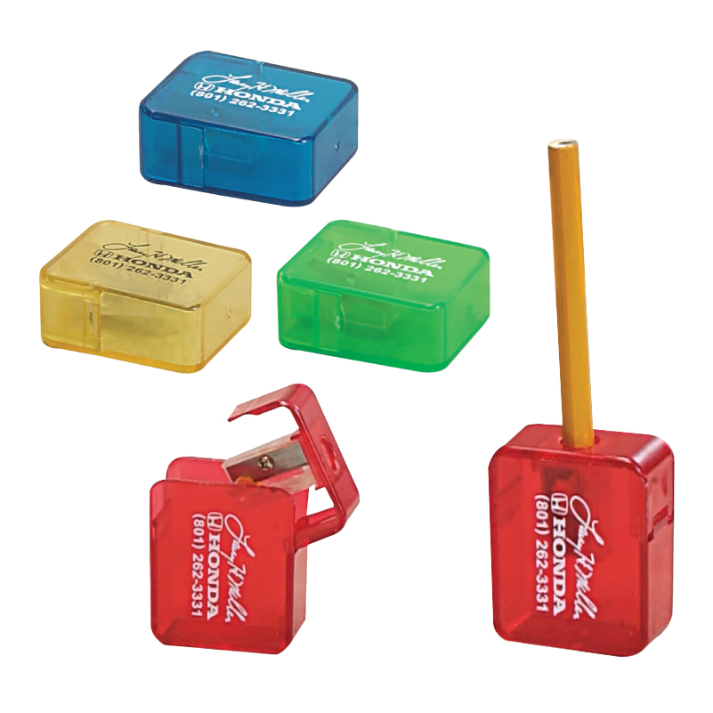 Transparent case design. Fits No. 2 pencils. Stainless steel blade. Flip-top lid for easy access to shavings. 1 7/16" L x 1 3/4" W