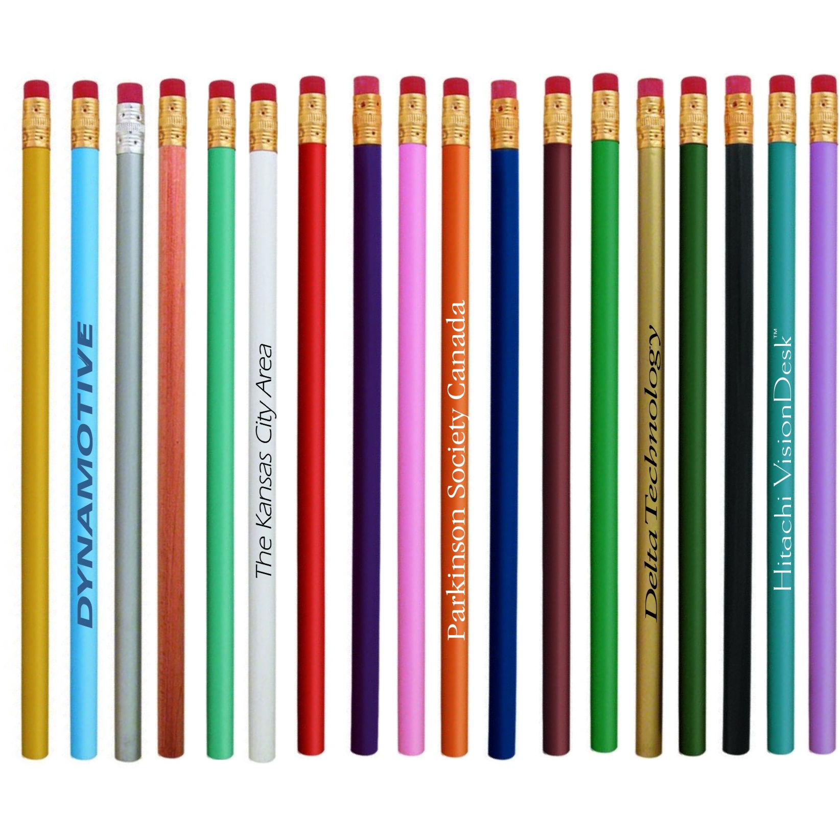 Colorful body #2 pencil with standard eraser; Sharpening is available, add. 0.03 /v.; Absolute Minimum: 150 pieces, Add 0.05 /v to 300 net price.; One color imprint only; Free paper proof and samples. 7 1/2" W x 5/16" H