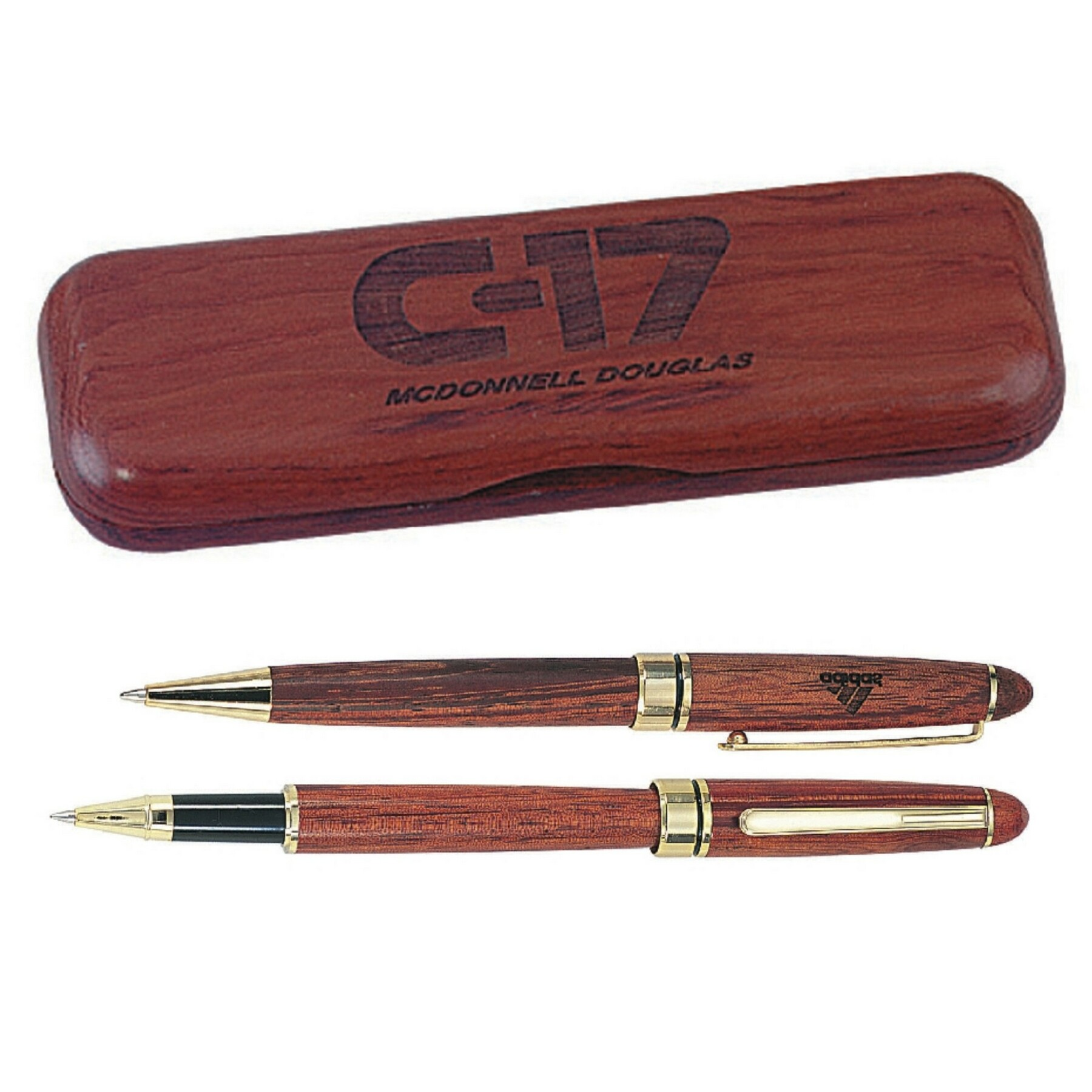 Rosewood ball point pen and rosewood roller ball point pen gift set. Price includes engraving one pen and roller pen. Additional cost for engraving on gift box.