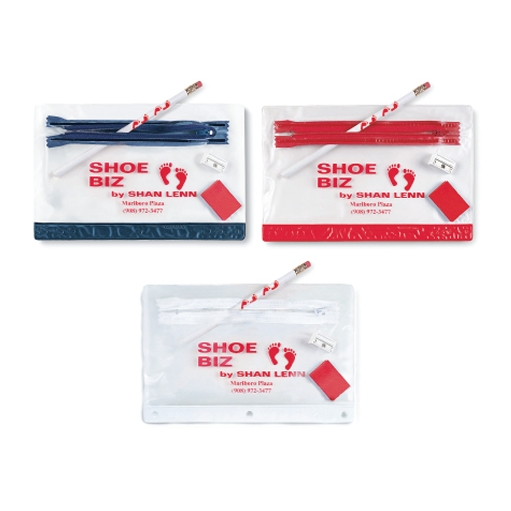 This Extra Value School Kit that fits any standard 2 or 3 ring binder features all your essential school supply items packed neatly in a transparent vinyl zippered pouch with colored zipper and bottom edge trim. Kit includes: 1 pouch w/imprint, 1 pencil w/imprint, 1 eraser and 1 thrifty sharpener. 9 1/4" L x 6" W