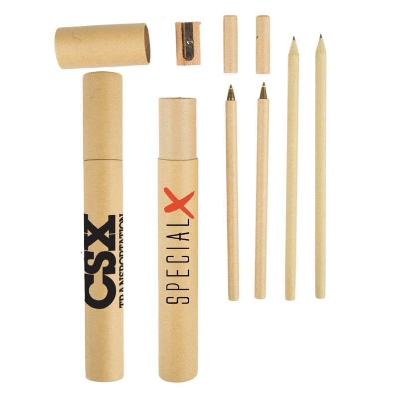 Cylinder shaped paper tube with (2) Pens: Black & Blue ink, (2) Pencils and (1) pencil sharpener. The paper tube is compact and easy to carry. 5 1/2" L