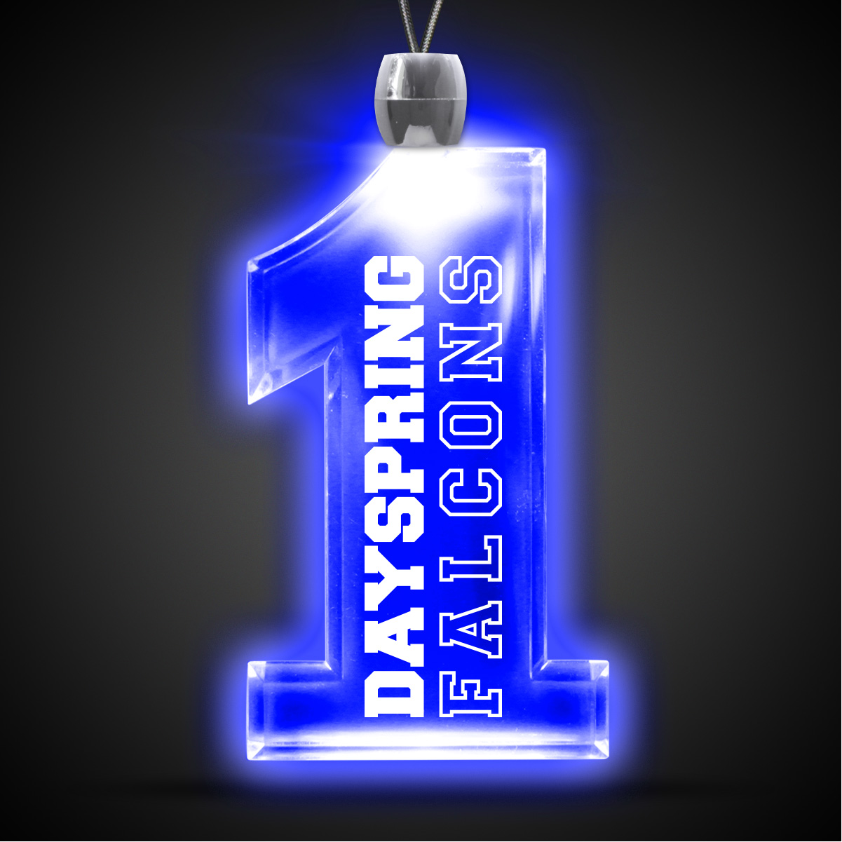 Light up the night at home and away nighttime games with our #1 Light Up Necklaces. These bright and bold necklaces are perfect for homecoming, fundraising, school stores, parades and school spirit events. Add some brightness to your cheers at night games when you wear our #1 Light Up Necklaces at sports games. Batteries are included and installed. Complies with CE, CPSIA, C-TPAT.