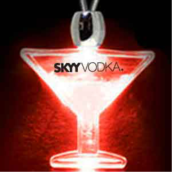 Lighted martini shaped charm necklace. Clear pendant with red LED. Breakaway clasp. 3-way light: slow flashing, quick strobe, steady-on. Long-lasting lithium batteries included. 1 5/8" W x 1 1/2" H
