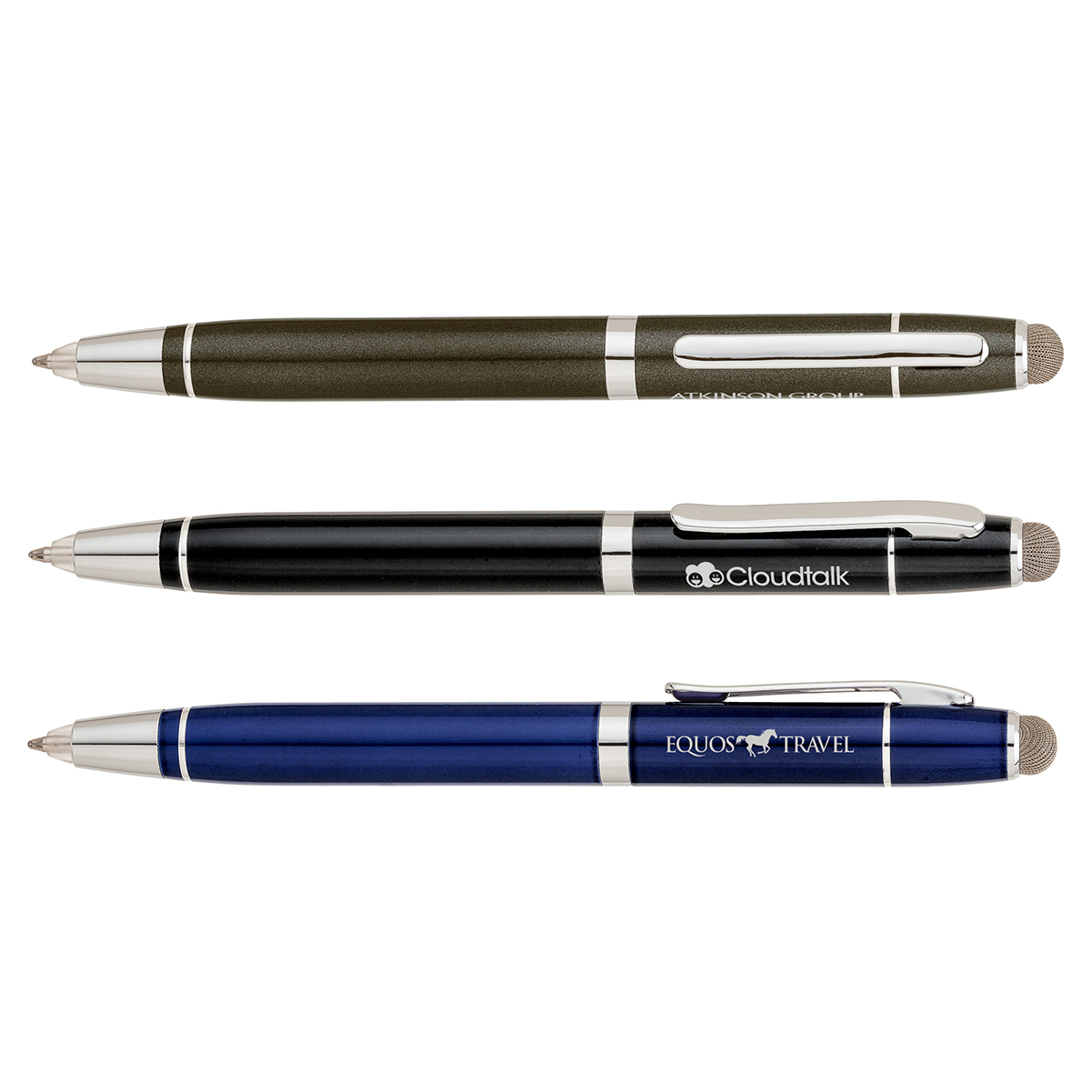 Twist-action aluminum ballpoint pen has etched chrome accents, LED light and a durable conductive fiber stylus. 9/16" W x 5 1/2" H x 7/16" D
