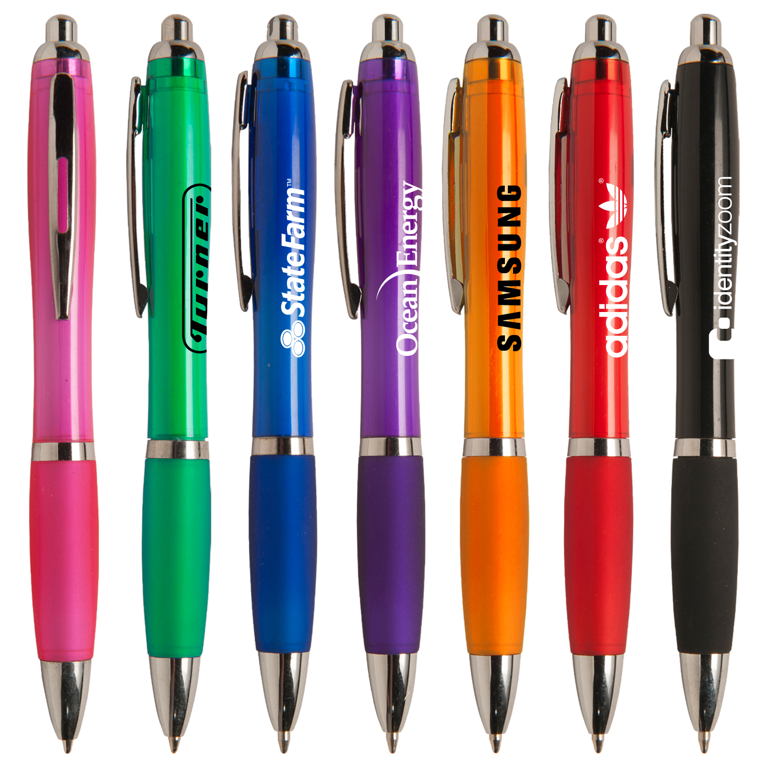 Classic retractable ballpoint pen with soft rubber grip, translucent colored barrel. Chrome ferrule, plunger, clip and ring. Matching colored rubber grip, black medium point and high quality Glide-Write ink. 5 1/2" L x 7/16" Diameter