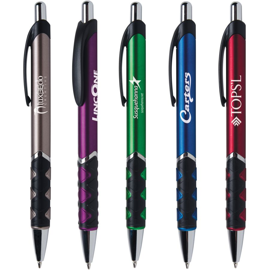 Deliver a message to your customers that is right on "point!" Great for schools, businesses and several other venues, the click-action Motogrip49838 ballpoint pen features shimmering metallic jewel tones that give it a metal-like look and a unique harlequin designed rubber grip for a comfortable hold. The shining chrome and black accents frame your imprint perfectly. For best results, the recommended imprint color is silver. Contains black ink only. Free 24 hour rush service available.