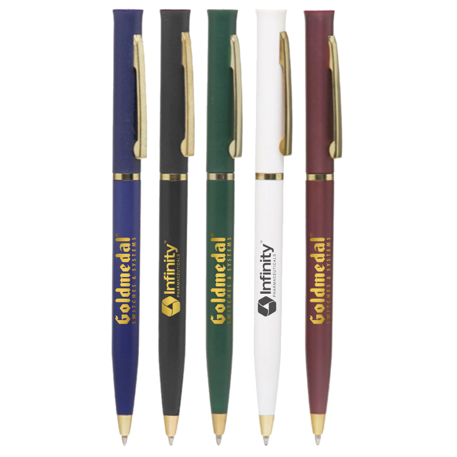 Union Printed, Promotional Hotel Desk Twist Pen, This Smooth Twist Action Ballpoint Pen Features An Elegant Gold Band, pocket Clip and Trim, give the pen flair! Perfect Promo Pen For Hotel Desks! Decorated in our Union Shop - Union Bug Available at No Charge!