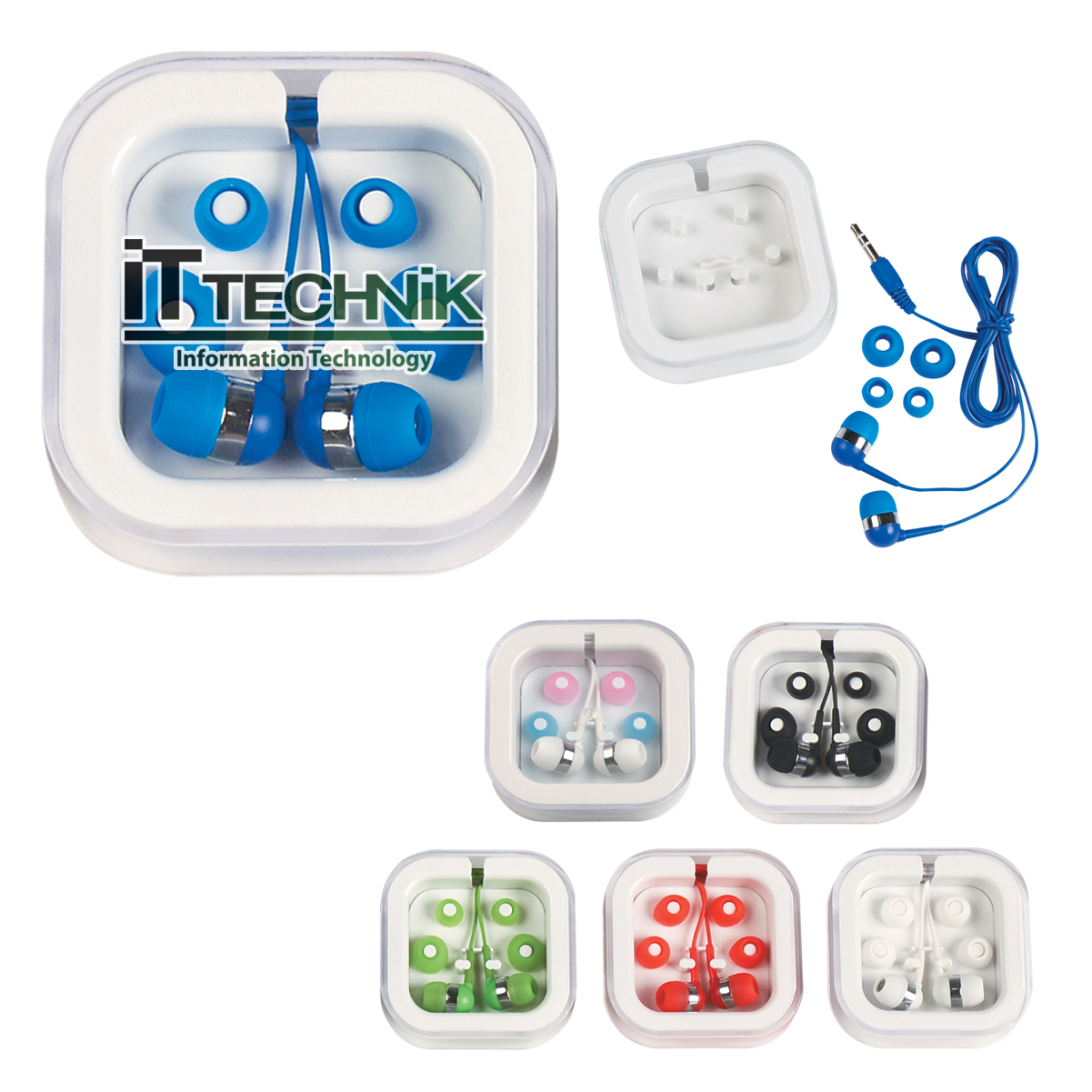 Protective plastic travel case. Interchangeable ear bud covers. Works with most audio devices and has 48" cord. 2 3/4" W x 2 3/4" H