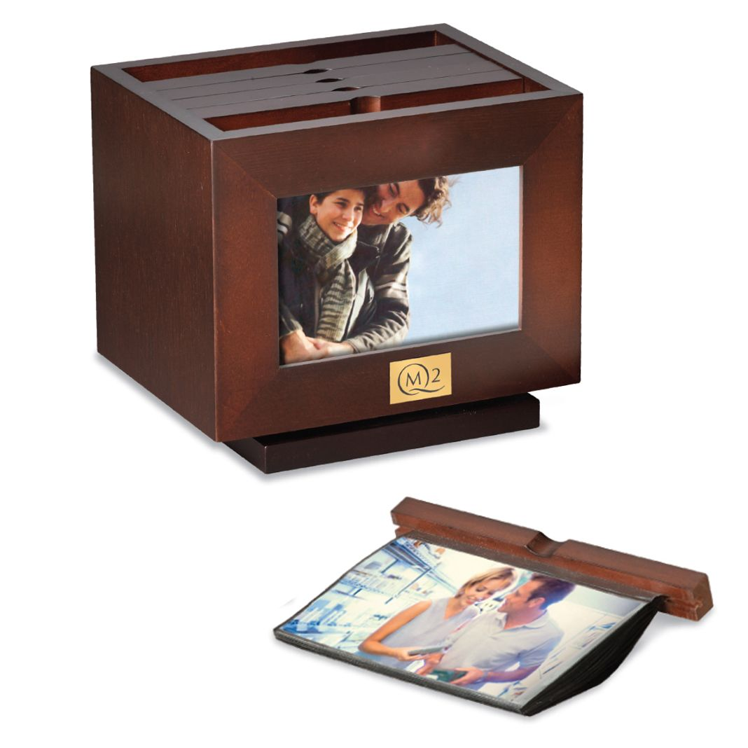 Classic photo box with swing stand showcases 2 of your favorable 4"x 6" photos. 5 inner albums holds 100 of 4"x 6" photos. Shown laser engraved logo on gold plate.