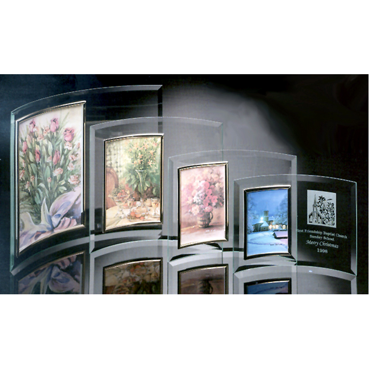 Memorial Crescent Beveled Photoframe. Jade glass. For 6"x4" photo. VERTICAL. The Photoframe is extraordinarily popular due to its double function. It is at once an award that gives recognition to the recipient and branding and marketing power by its etched logo or seal, on the one hand. The photo serves a second purpose: that purpose depends on the nature of the photo. It might be to build teamwork if a group photo or to inculcate pride in the company/ institution. 8" H x 11" W x 3/16" Thick