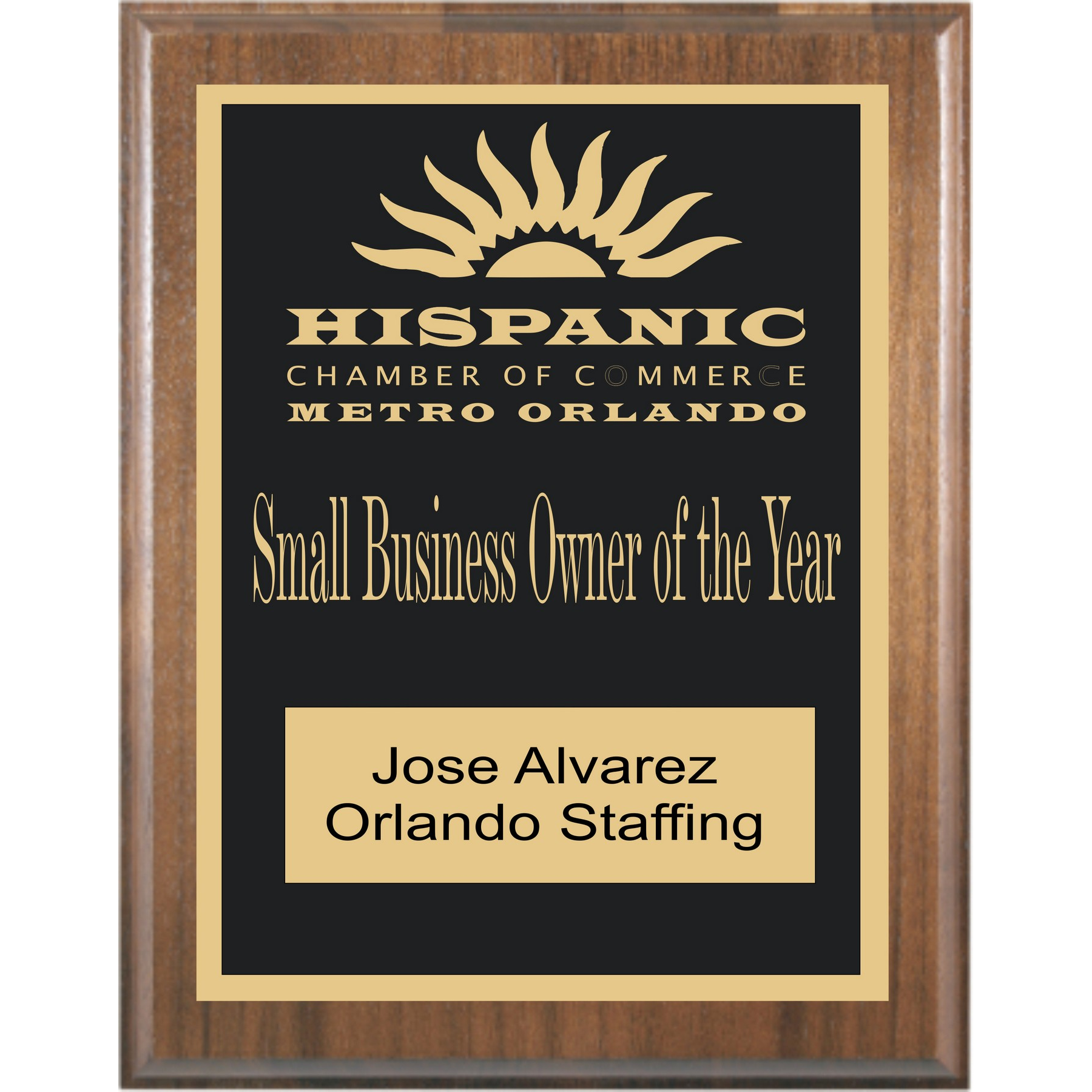 This 6"x 8" Precisions Walnut Plaque features a beautiful walnut veneer finish and a 4" x 6" brass plated steel plate. The black plate features a 1/8" gold border and arrive with your personal message in gold. An elegant way to honor any achievement!!!. 6" W x 8" H