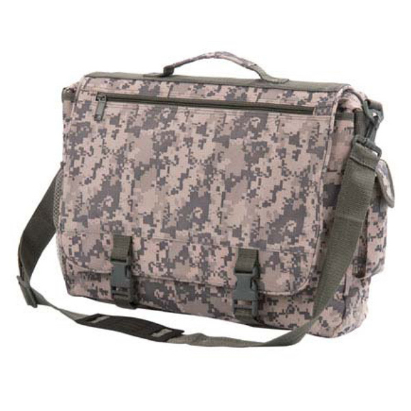 Military imprint portfolio / messenger bag. Large zippered main compartment. Open end pocket. Large and small zippered pocket. Complete organizer. Front and back zippered pockets. Carry handle. Adjustable / detachable shoulder strap. 600 denier polyester. 16" W x 12" H x 4 1/2" D