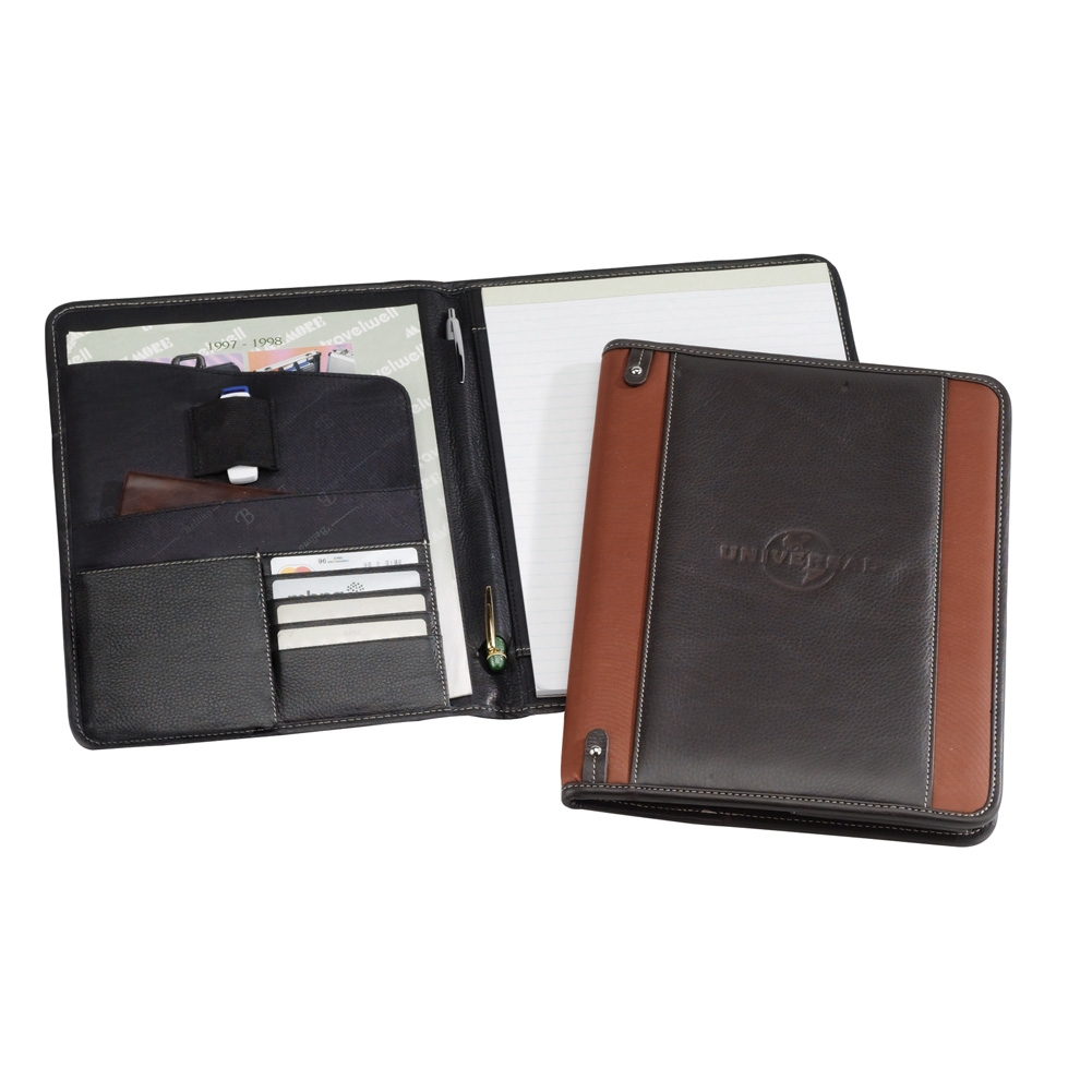 The ultimate in class and style, this stunning padfolio combines rich Napa leather and sleek, fine-weave nylon, accented with a cream saddle stitch. Features include an exterior pocket and numerous interior pockets for a USB, letters, notes, business cards and pens. Includes an 8.5"x11" lined writing pad. 9 1/2" W x 12 1/2" H