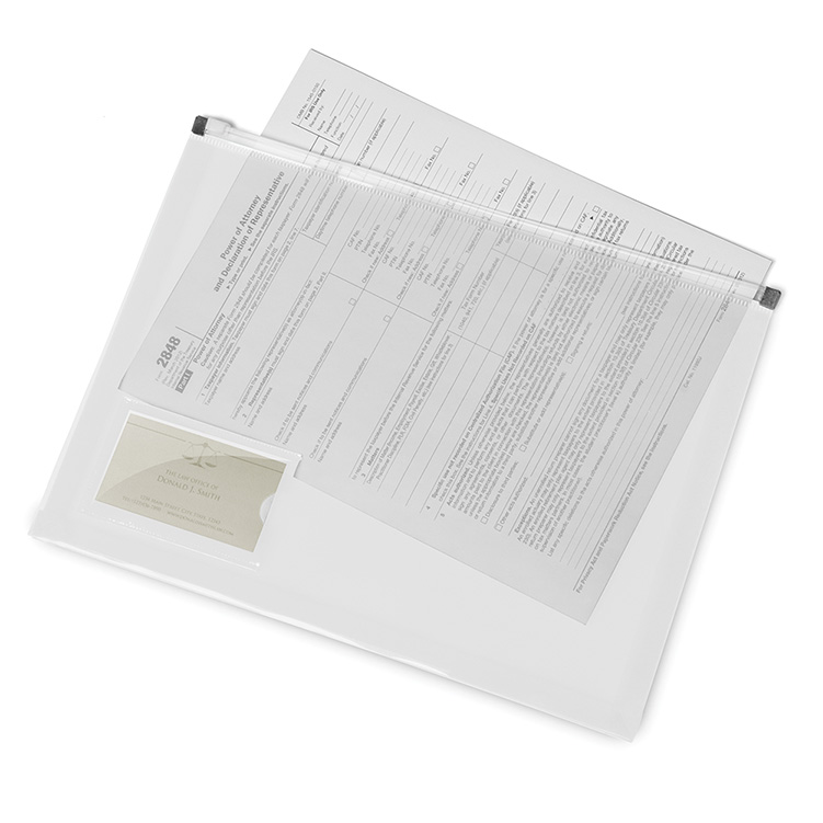 Translucent letter size zipper pocket portfolio. Full clear pocket on front and business card pocket on back.1 1/4" Gusset. Lightweight and ideal for travel or all your important papers. 9 11/16" H x 13" W