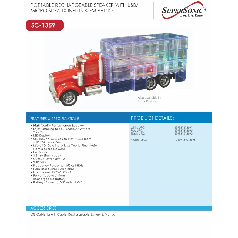 High Quality Performance Speaker Enjoy Listening to Your Music Anywhere You Go LED Display USB Input Allows You to Play Music From a USB Memory Drive Micro SD Card Slot Allows You to Play Music From a Micro SD Card FM Radio 3.5mm Line-in Jack Output Power: 3W x 2 SNR: =80db Frequency Response: 150Hz 18KHz Horn Size: 52mm / 2 x 4 ohm Input Power: DC5V 500mA Power Supply: Lithium Rechargeable Battery