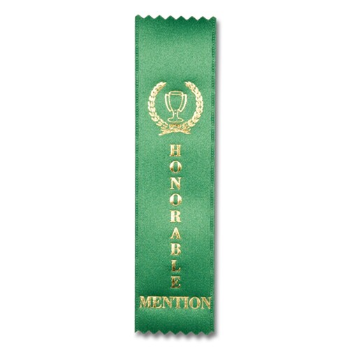 2" X 8" Stock Ribbons: HONORABLE MENTION Stock Placement Ribbons comes pinked at top and bottom, printed with gold imprint. Places available: 1st thru 6th place and with Honorable Mention, Special Award, Participant and Perfect Attendance. Ribbons are bundled in quantities of 25 and you can mix places to meet minimum orders. Stock item, ships as shown. 2" W x 8" L