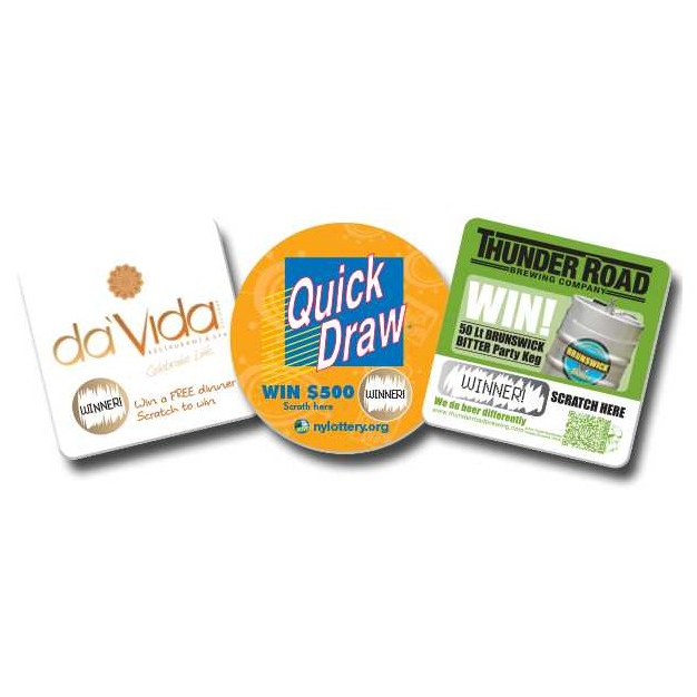 Running a contest? Need to hide a code for redemption of a gift or prizes? Now you can design your coasters with a scratch off area and hide your special messaging. Perfect for regional or national contests or giveaways, scratch n win coasters are a perfect way to grab your customers attention. Full color printing on both sides, with your choice 3.5" or 4" circle or square, with 3 thickness options (light, medium, heavy) Contact us for pricing. Please see SAGE #69052 for CDN pricing