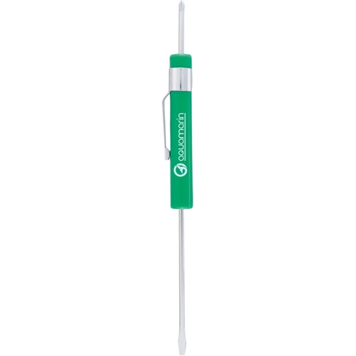 ABS plastic with carbon steel. Pen-style tool with pocket clip. Flathead screwdriver with Phillips function on top. 6.25" L x 0.375" Diameter