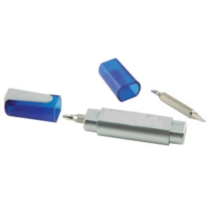 Screw Driver Kit contains two slotted and two Phillips bits with a pocket clip. 3/4" D x 4 3/4" L