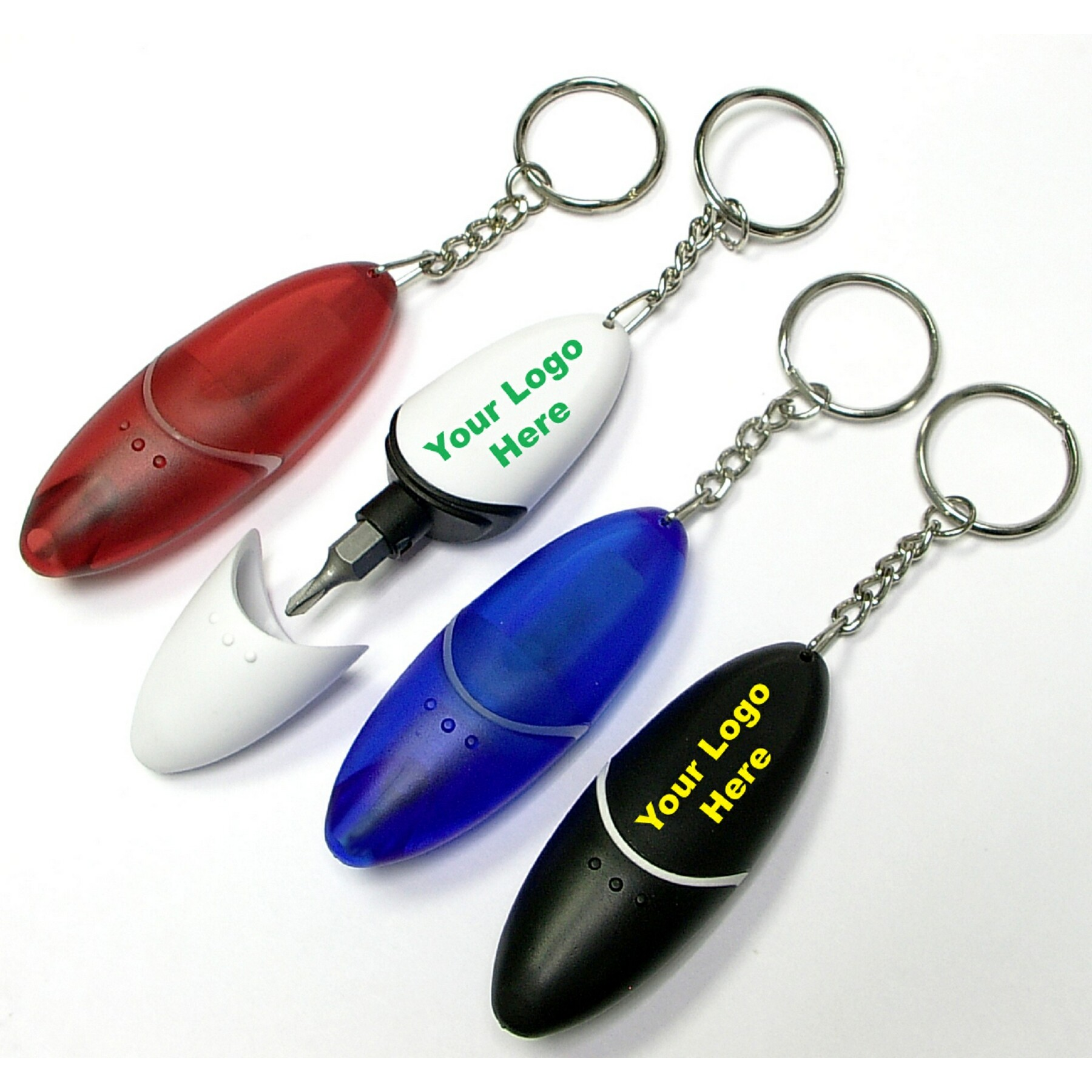 Screwdriver tool kit with keychain. It has 2 sided Phillips and flat head driver bit. Designed for promo gift, trade shows, sports, events, safety program, out doors, camping, emergency and school. 2 3/4" L x 1" W