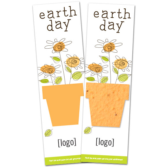Seed Paper Shape Bookmark - Earth Day The Easy Way - Flower Shape - This Earth-friendly bookmark features a seed paper flower style shape attached to a card stock bookmark, custom printed in full color. Perfect as an Earth Day or holiday bookmark for eco-themed promotions. Our seed paper is handmade from 100% recycled material and embedded with a hearty mixture of wildflower seeds. It really grows when you plant it! Size: 2.25"x7.75". Paper: Cardstock; original seed paper/integrated. 2.25" W x 7.75" H
