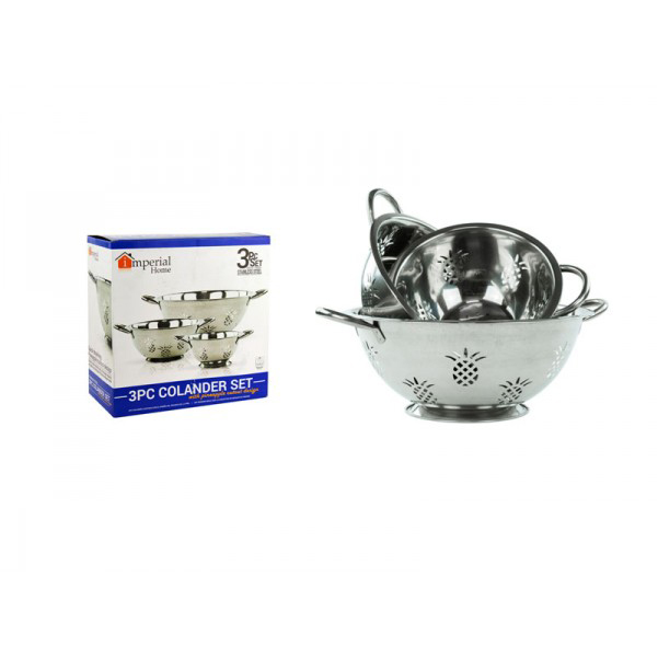 Pineapple design cut out for quick draining. Stainless steel is durable, dishwasher safe, and non-reactive. Sturdy, easy to grip handles. Sizes - 2 quarts, 3 quarts, 5 quarts.