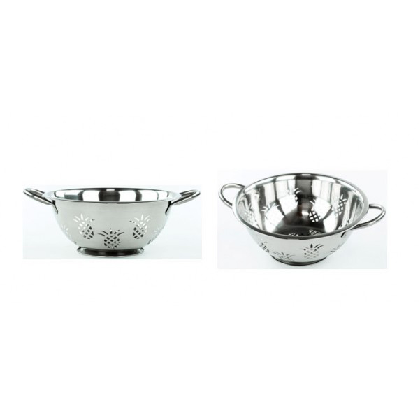 Pineapple design cut out for quick draining. Stainless steel is durable, dishwasher safe, and non-reactive. Sturdy, easy to grip handles.