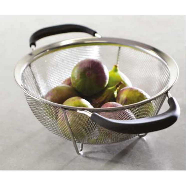 Thanks to the raised footed base you can use the colander for serving and washing fruits and vegetables, draining, steaming and deep frying. Sturdy welded cross feet provide stability. 18/10 stainless steel provides durability and TPR covered handles are for a sure and safe grip. Great gift for customer appreciation or employee incentives in food service, wellness, grocery or any other industry. 10" Diameter x 4" H