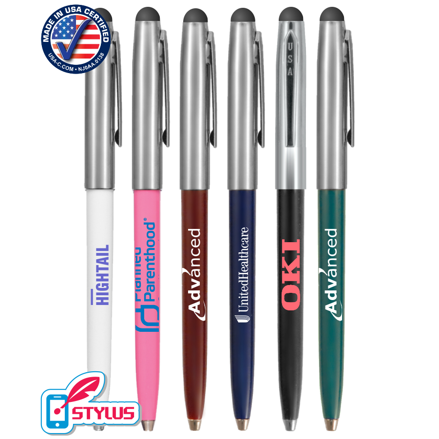 Union Printed, "Metal Stylus" Push Ballpoint Pen - Silver / Metal Tops with Colored Bottom. - Stylus Rubber on top of Pens. A Perfect Give-away Low Cost Promotion, Never a need to Shop for Close-outs. Union Bug Available at No Charge!