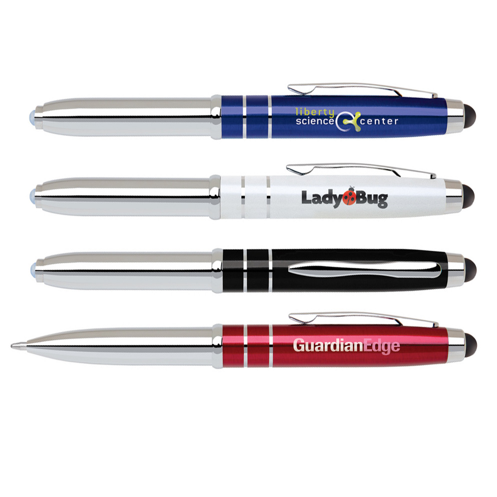 This multifunctional iPad capacitive pen features a built in LED flashlight. This 5" pen features an elegantly designed chrome barrel, matching chrome trims and a translucent lacquer color finish for a complete look. Available in a variety of colors, customize the item to your specifications. Please note, lasers to a silver finish and each stylush is individually gift boxed for professional and elegant presentation. Great for tech themed events!. 5" L