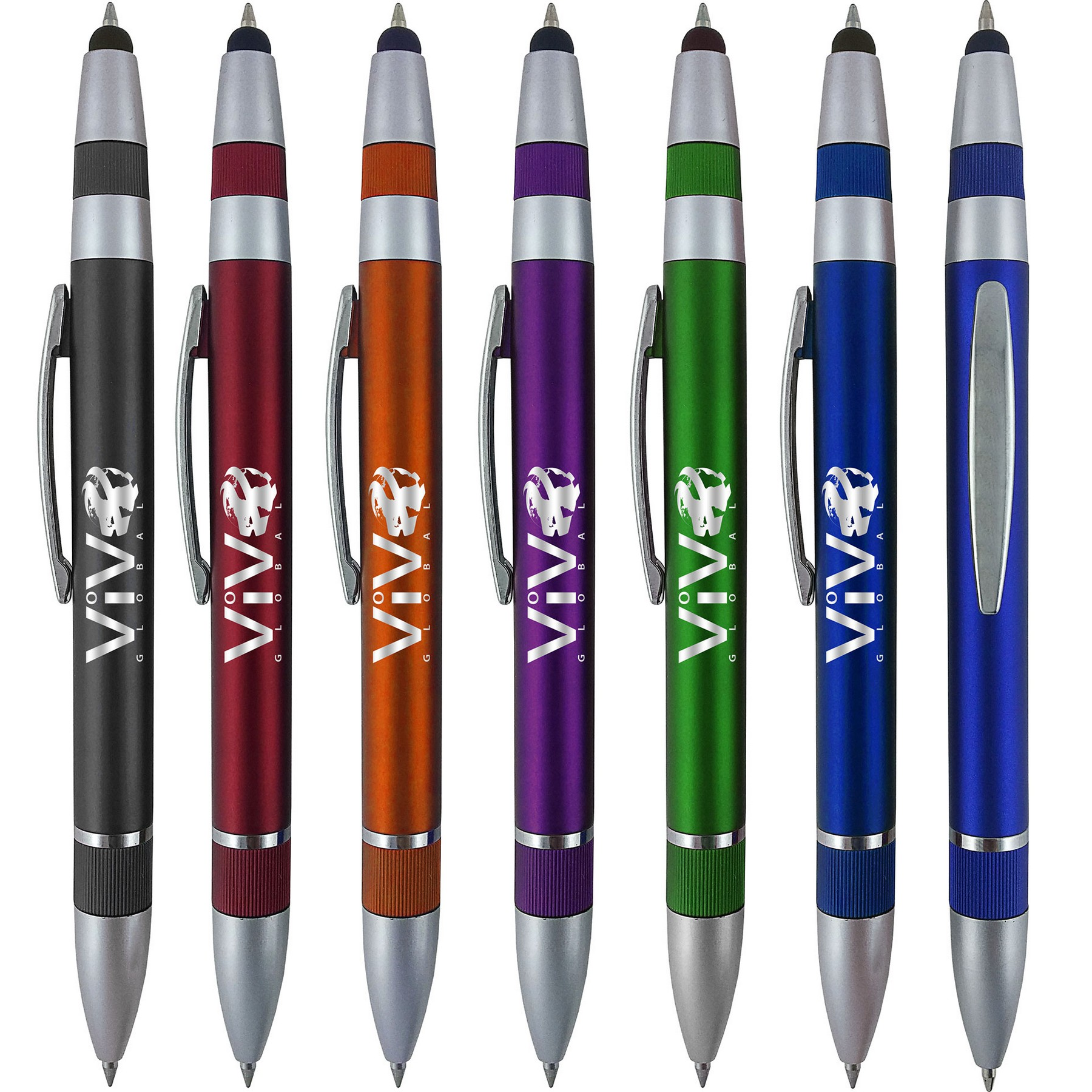 The Spencer Stylus is a 3 in 1 multi-functional pen. Duo inks (Black & Blue ink) along with a stylus pen tip for today's touchscreen electronics. Multi twist pen comes with a solid colored barrel with chrome metal clip and silver accents. A winner in any industry.