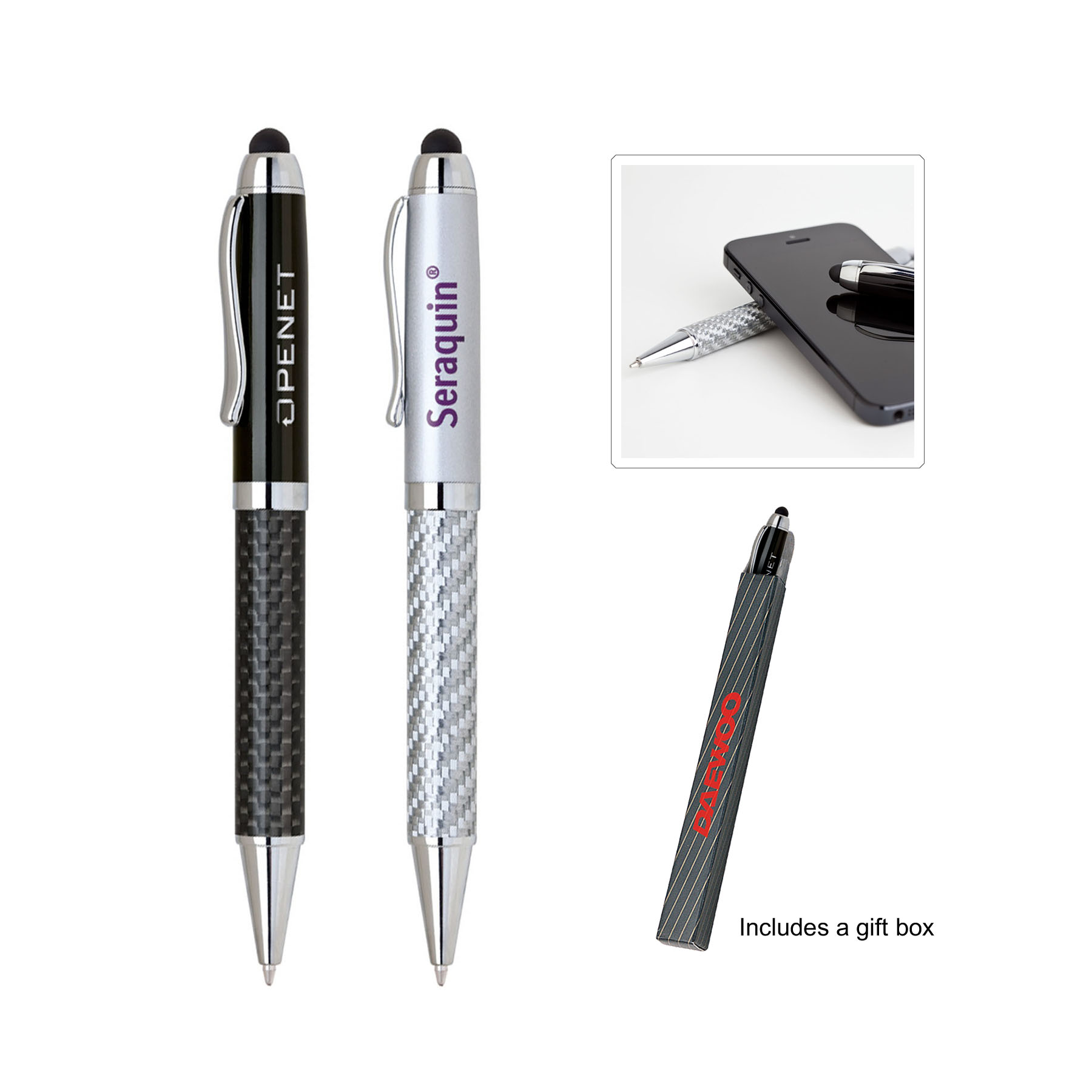 Heavy brass ballpoint pen with a touchscreen stylus. Genuine carbon fiber with choices of black and silver colors Fully compatible with all touchscreens. 5 1/2" L