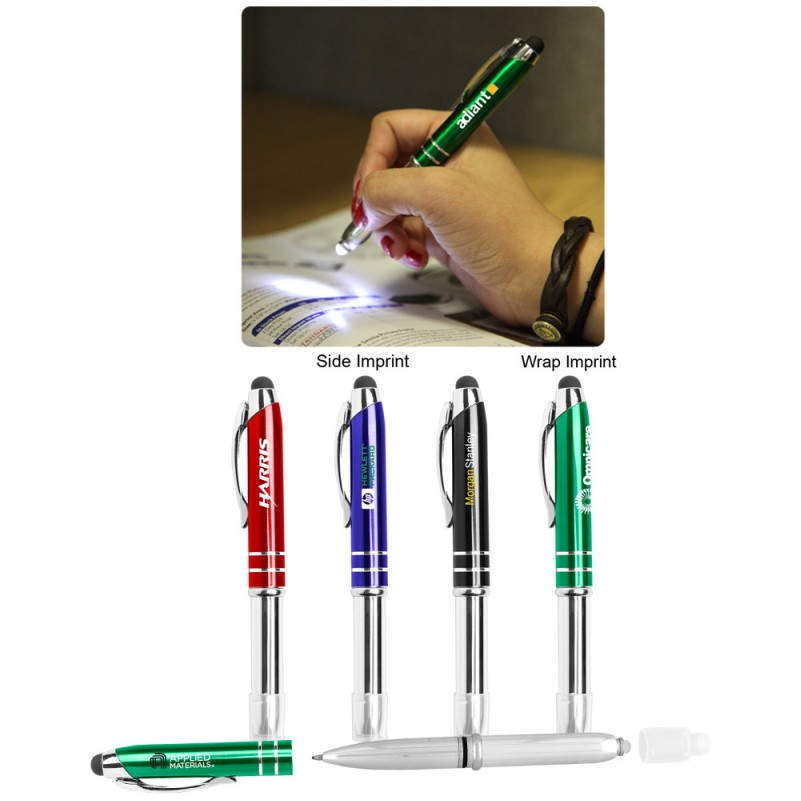 A Tri-purpose plastic pen featuring a soft stylus orb and flashlight. This pen works great with your mobile device, iPad, tablet, or other tech devices. Price includes a 1 color imprint. Includes black ink. 5 1/8" L