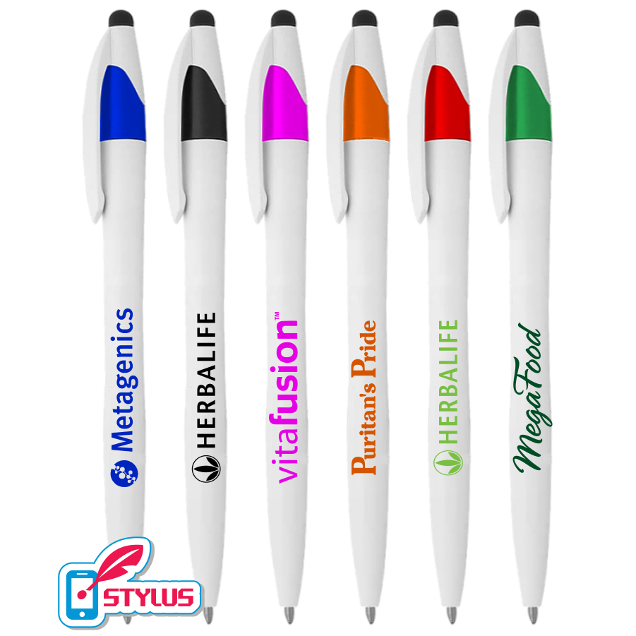Union Printed "Slick" Stylus Clicker Pen, Attractive White Barrels with Colored accents Also Features a Responsive Stylus Point on Tip for Smartphones and Tablet Devices, this stylish Stylus Click pen Is Ideal for those looking to finally get their business noticed! Union Bug Available at No Charge!