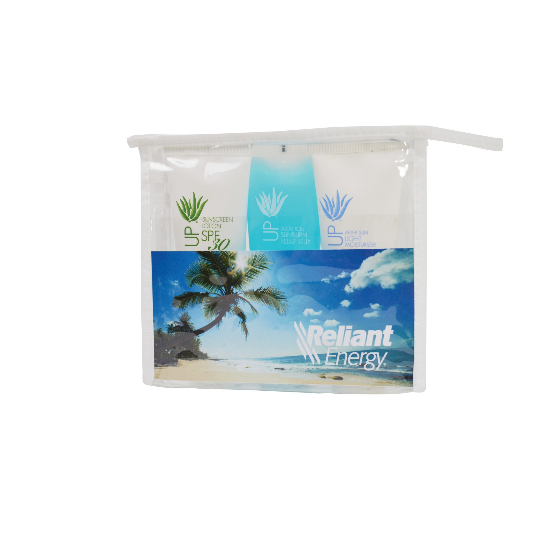 Large Vinyl Kit includes White Collection SPF 30 4 oz, Aloe Ice Sunburn Relief Jelly 4 oz, After Sun Lotion 4 oz, SPF 15 Lip Ice. Complies with FDA. 7 1/2" W x 7" H x 1 1/2" D