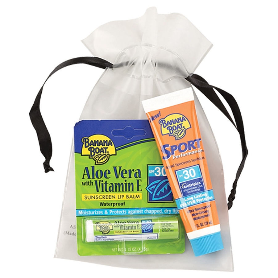 Frosted EVA bag with polyester ribbon, includes 1 Oz. SPF-30 Banana Boat sunblock and aloe vera SPF-30 sunscreen lip balm. We have a huge selection of sun kits in stock. Be sure and check out our entire collection. We specialize in custom kits !. 5 3/4" W x 9" H