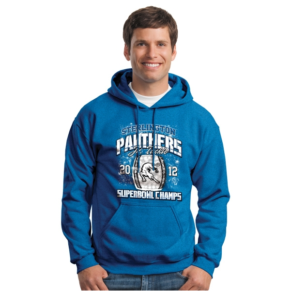 50% cotton, 50% polyester. Air jet yarn creates a smooth, low-pill surface. Pouch pocket and matching drawstring. 1x1 athletic rib with spandex, and double needle stitching and cuffs.