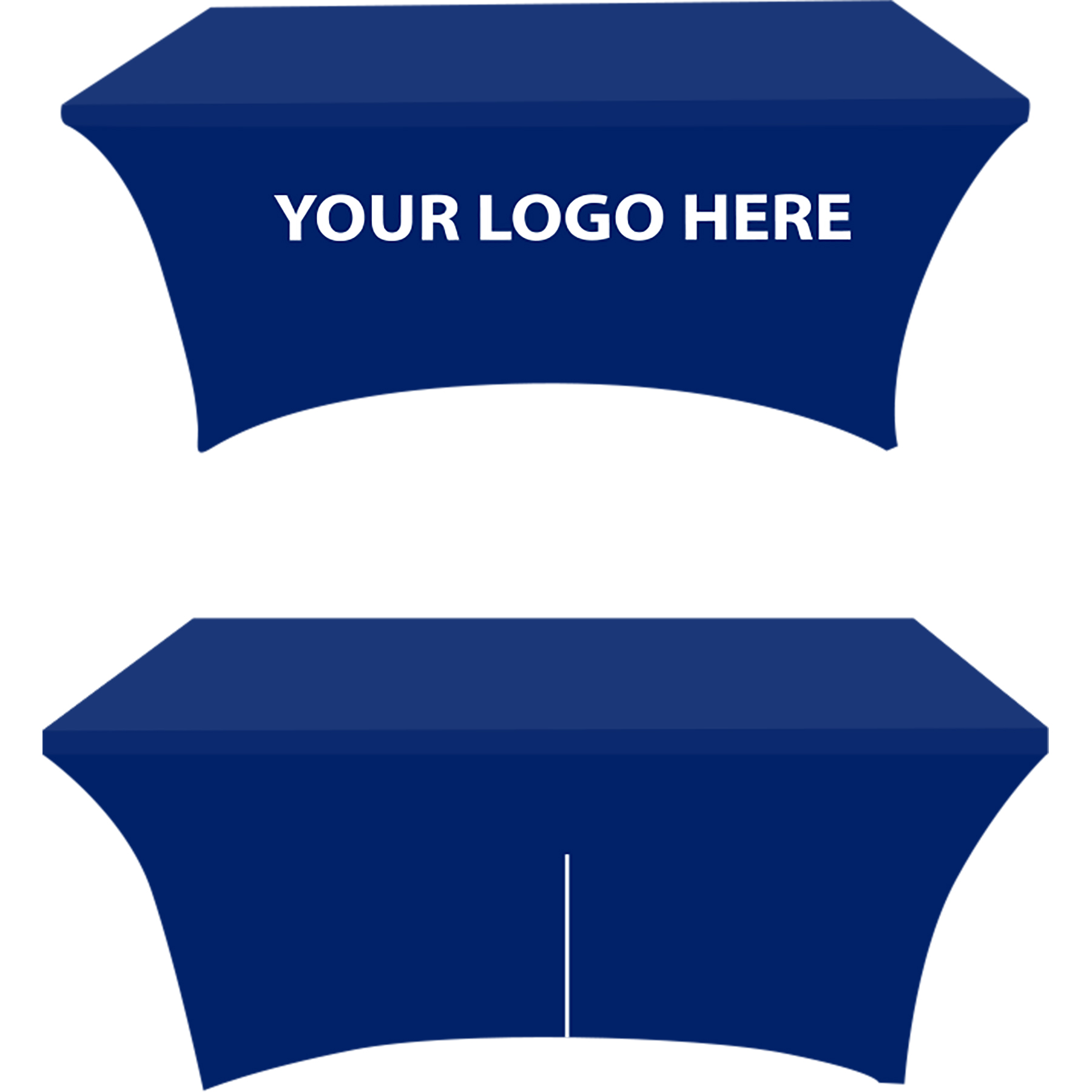 Display your logo neatly at an event with this 4' customized zipper back stretch style table cover! Demand attention and draw crowds to your table at conventions, conferences and tradeshows with this fully customized zipper back stretch style table cover. We start with 4' of white polyester material and finish it with a PMS color background and custom logo design, digitally printed directly onto the cloth. It's designed for a standard 4' table. 79" L x 92" W