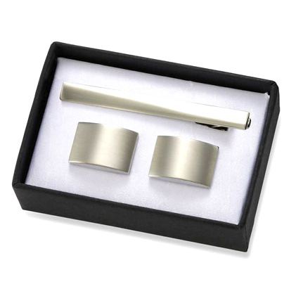 Matte Silver Rectangle Metal Cufflinks w/ Matching Tie Clip. 3 1/4" W x 2 1/4" H x 1" D
