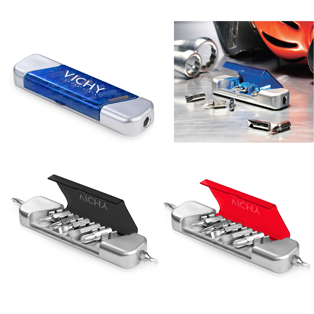 The mini utility kit features flat head metal bits and Phillips metal bits in a window case. The bits can be inserted into the magnetic screwdriver tip for quick fixes and simple every day repairs. The compact size and versatilty of this item makes it easy to carry and extremely useful. Great item for home and repair shops, insurance and construction companies and much more. 4 1/4" L x 1.18" W x 0.6" Thick