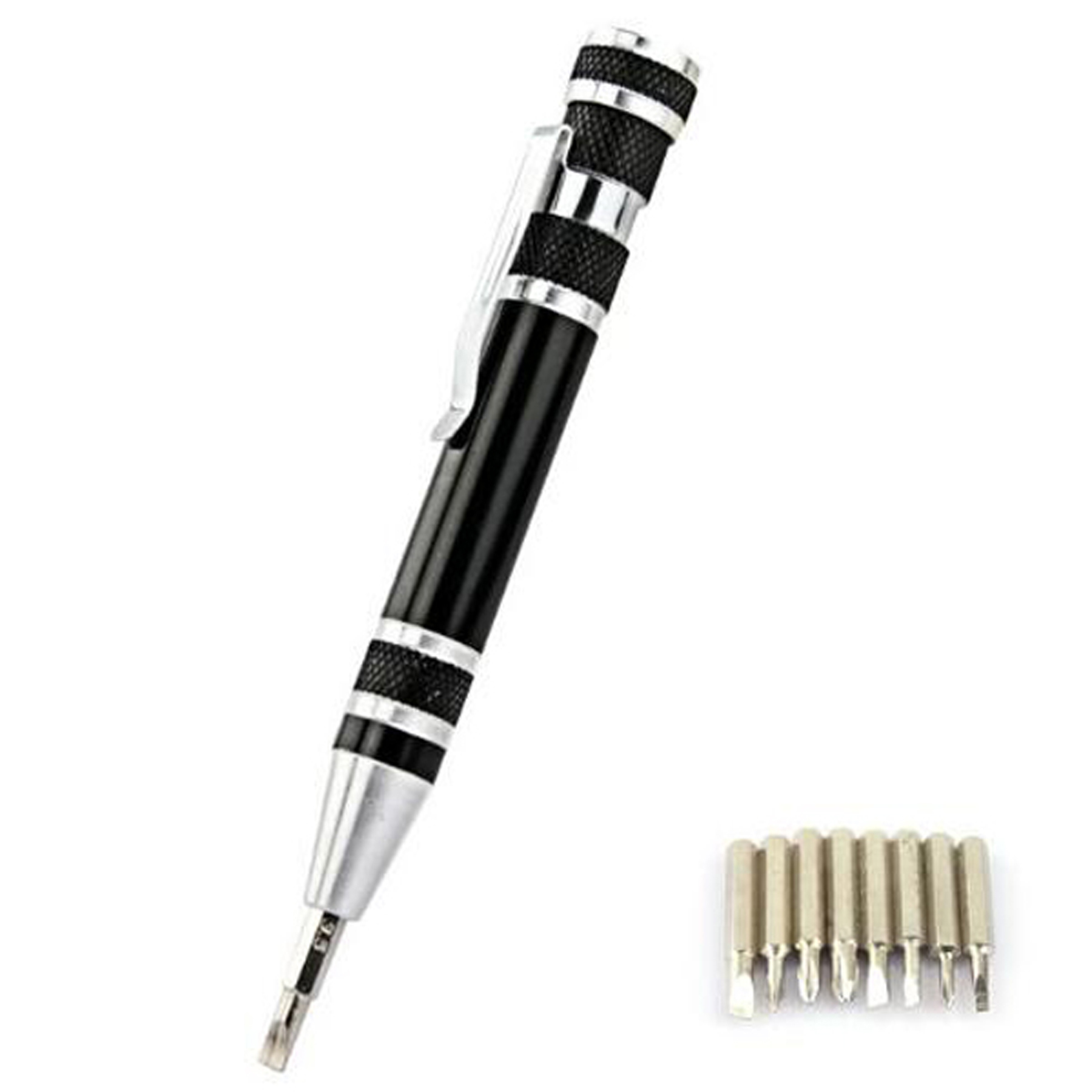 This engineer multi-tool looks like a pen, including 2 Phillips, 3 star head bits, 1 flathead bit, 1 bent flathead bit, and 1 spanner bit. Twist-off cap for bit storage. Magnetic base. Durable metal clip. It is a amzing promotional gift with your brand on it. 4 2/5" L