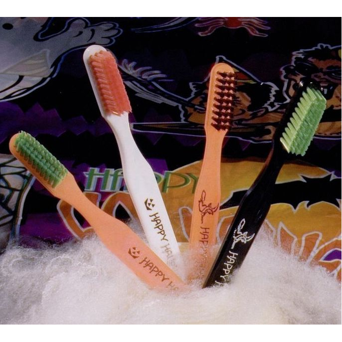 With the same features as our Hot Colored Toothbrush, it combines the professional quality of an ADA accepted toothbrush and the colorful Halloween colors. This is a very popular item with Dentists, Orthodontists, and Insurance companies during their open enrollment periods in the Fall. The toothbrush is a perfect size for both adults and children. The BSI Halloween toothbrush features the highest quality DuPont soft textured bristle. Union made in the USA.