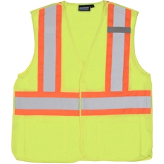 100% polyester mesh. Hook & loop front closure. Microphone tab on left side. Reflective tape backed by contrasting orange trim. 2 interior waist pockets with hook & loop closure, 7"x7". Conforms to ANSI/ISEA 107 standard for design, color and reflectivity.
