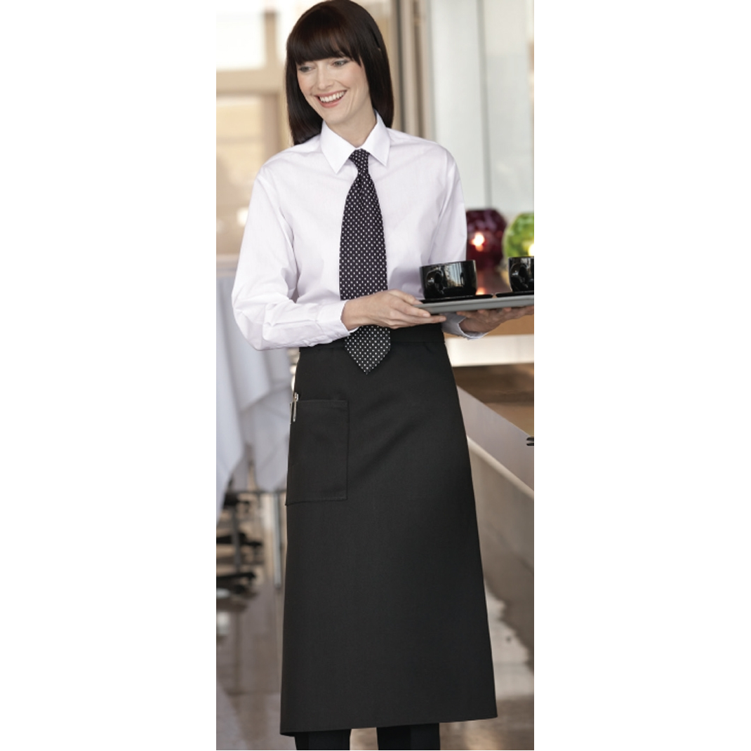 7.5 Oz. 65/35 poly/cotton twill. Full bistro, 1 pocket with pencil insert. 28" W x 33" H